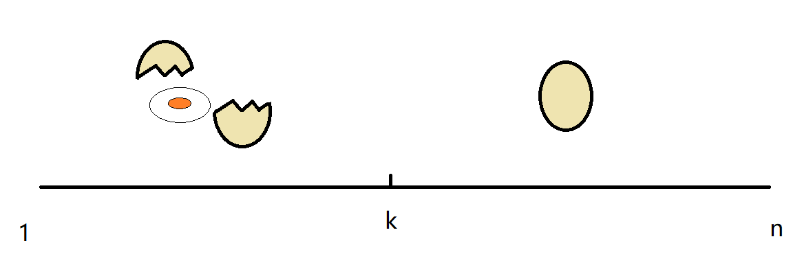 如果鸡蛋碎掉,答案楼层 $f$ 就应当在$1~k$中,如果鸡蛋不碎,答案楼层 $f$ 就应当在 $k + 1 ~ n$ 中;