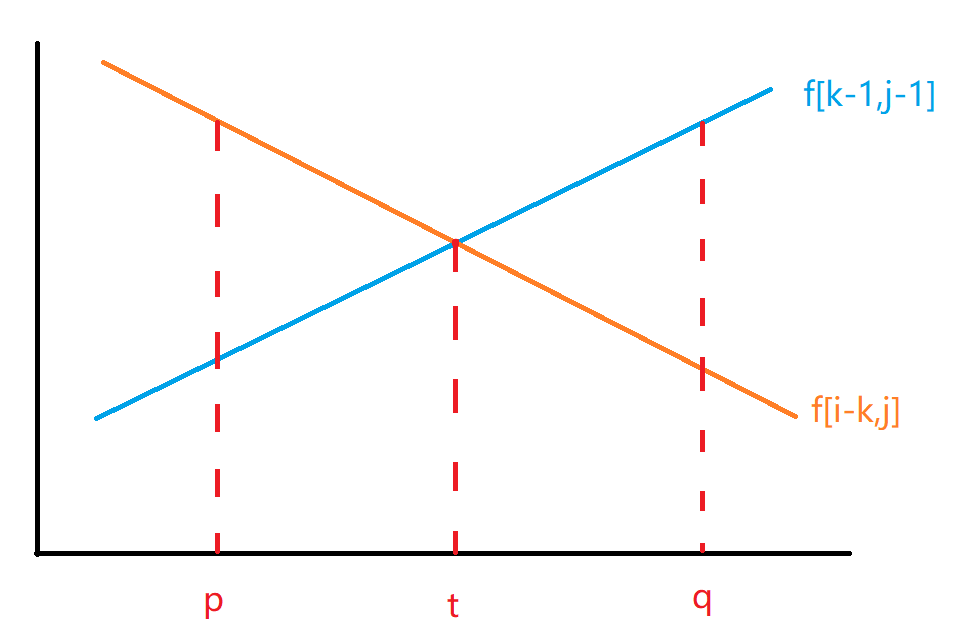 回到式子来,$f[k - 1,j - 1] , f[i - k,j]$,随着$k$的增加,$f[k-1,j-1]$应当是递增的,而$f[i - k,j]$则应当是递减的,因此可以得出下面这张图: