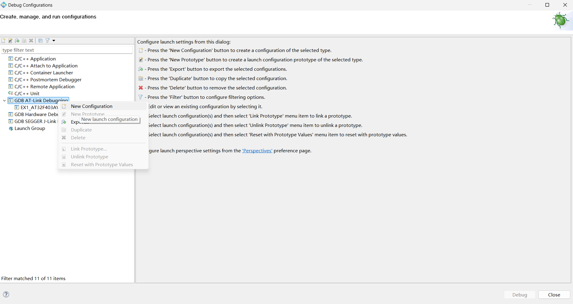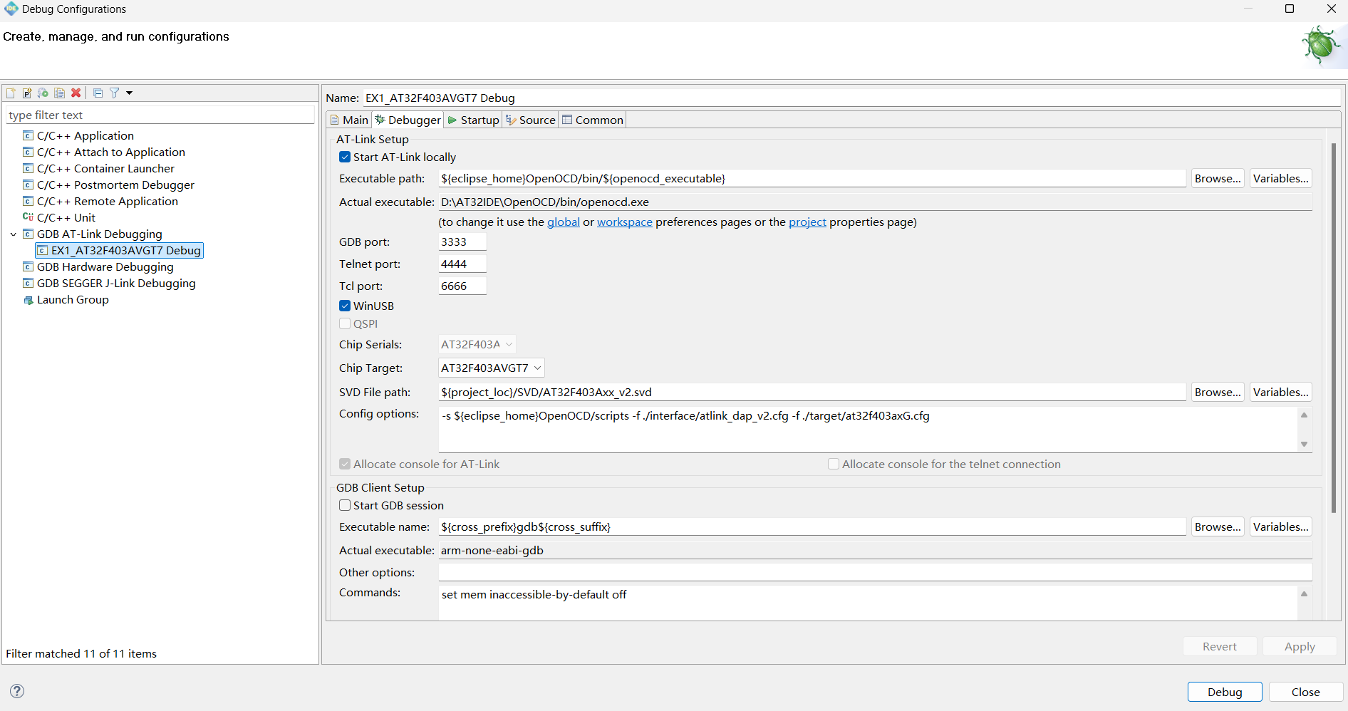 - 项目调试:以 GDB 作为调试工具,支持暂停、单步、运行和监视目标芯片,能存取内存及闪存,还支持设置硬件断点及检测点,也可以抹除目标芯片和编程用户配置。调试前,选择菜单【Run】>【Debug Configurations…】打开调试配置对话框,双击 GDB AT-Link Debugging 自动创建 AT-Link 调试配置,大部分配置信息会自动生成,一般无需修改。在调试透视图,可查看变量值、表达式值、外围寄存器等 。