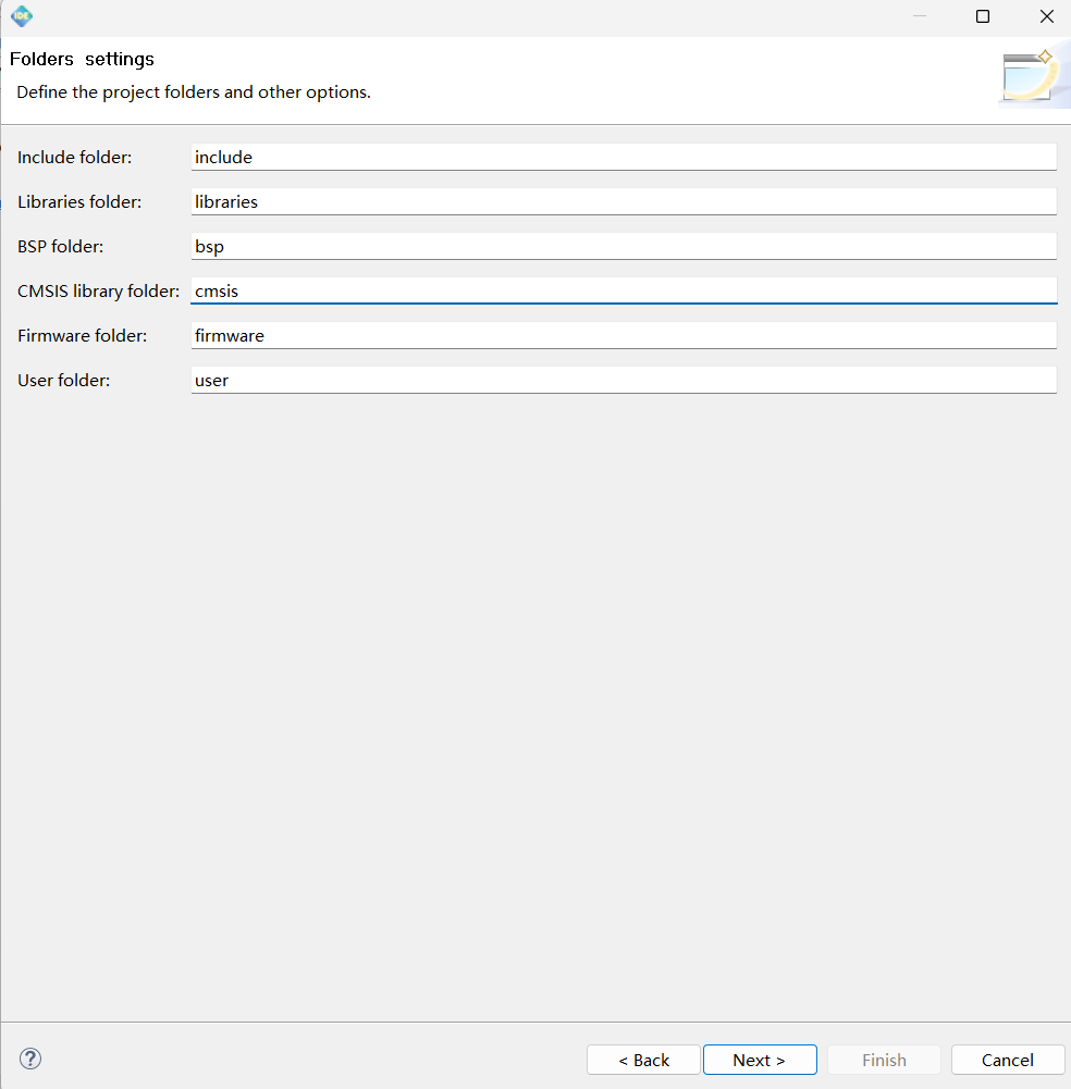 界面标题 “Folders settings” + 说明文字 “Define the project folders and other options.” ,功能是让开发者指定项目中不同类别文件的存储路径,方便工程文件分类管理、工具链 / 编译器识别依赖,让代码编译、链接流程更清晰。