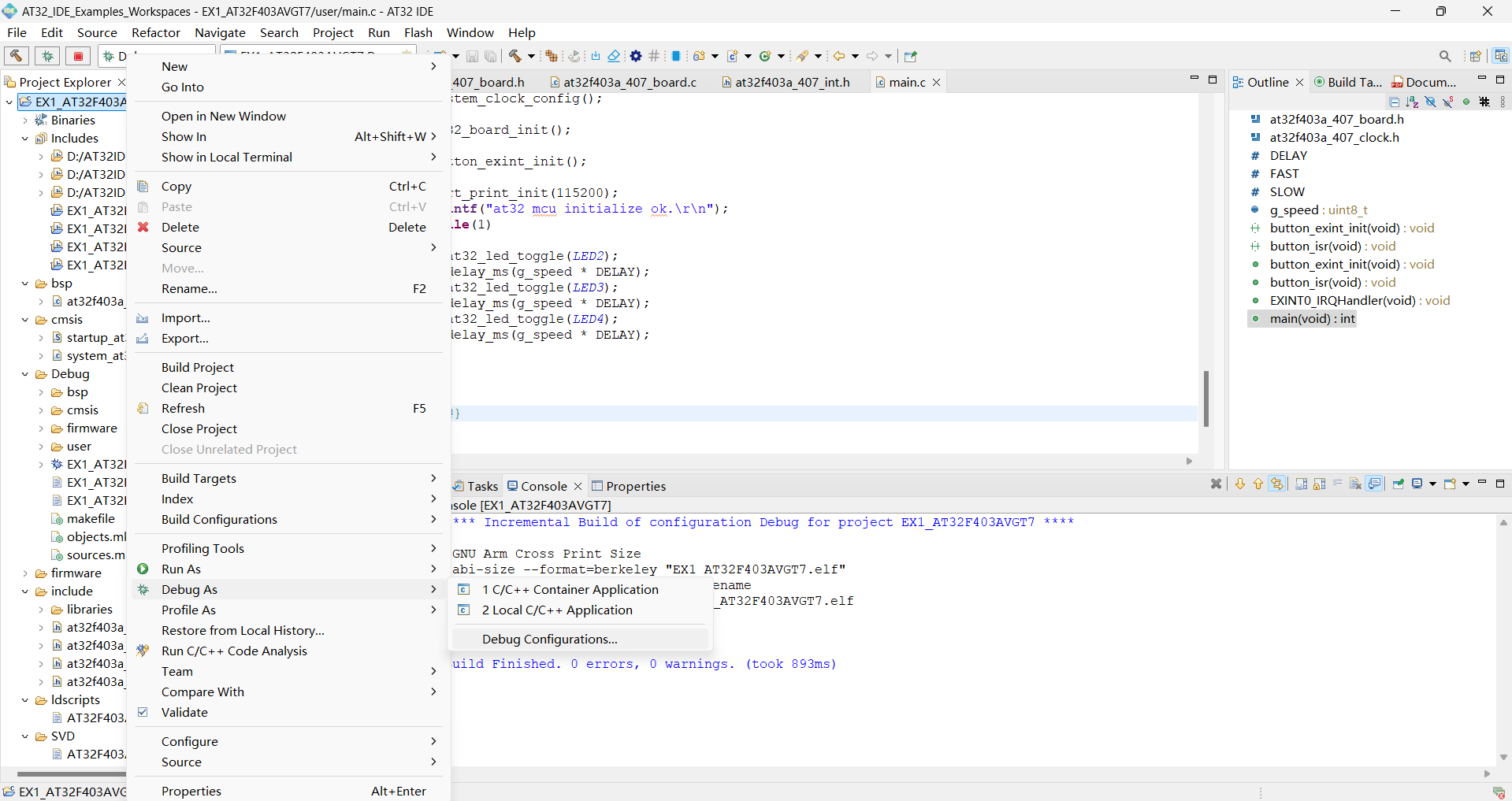 - 项目构建:使用 GNU ARM 工具链来构建项目。构建时,右键单击项目,选择 “Build Project”,或者选中项目后点击菜单栏的 “Build Project”,即可生成 elf 文件,构建日志会在控制台打印。若需重新配置构建选项,可选择菜单【Project】>【Properties】或右键项目选择【Properties】,在 C/C++ Build>Settings 中更改配置,应用设置后重新构建项目 。