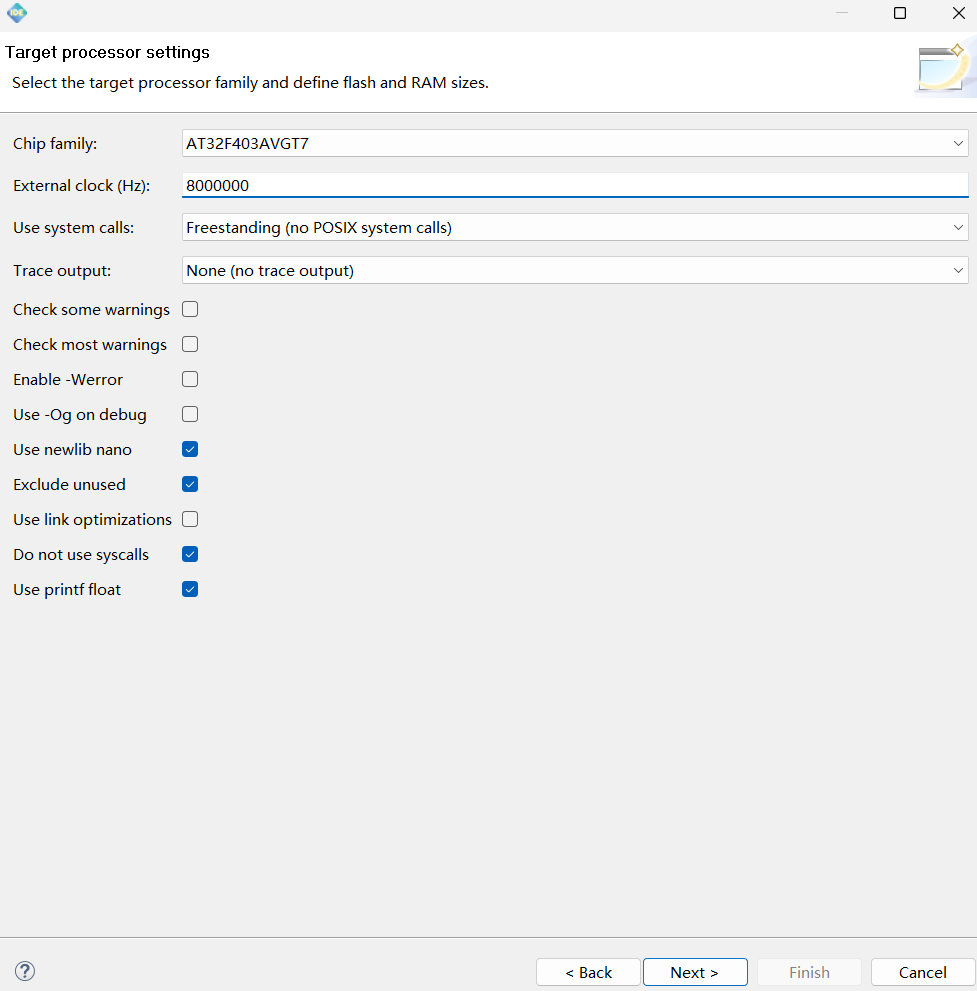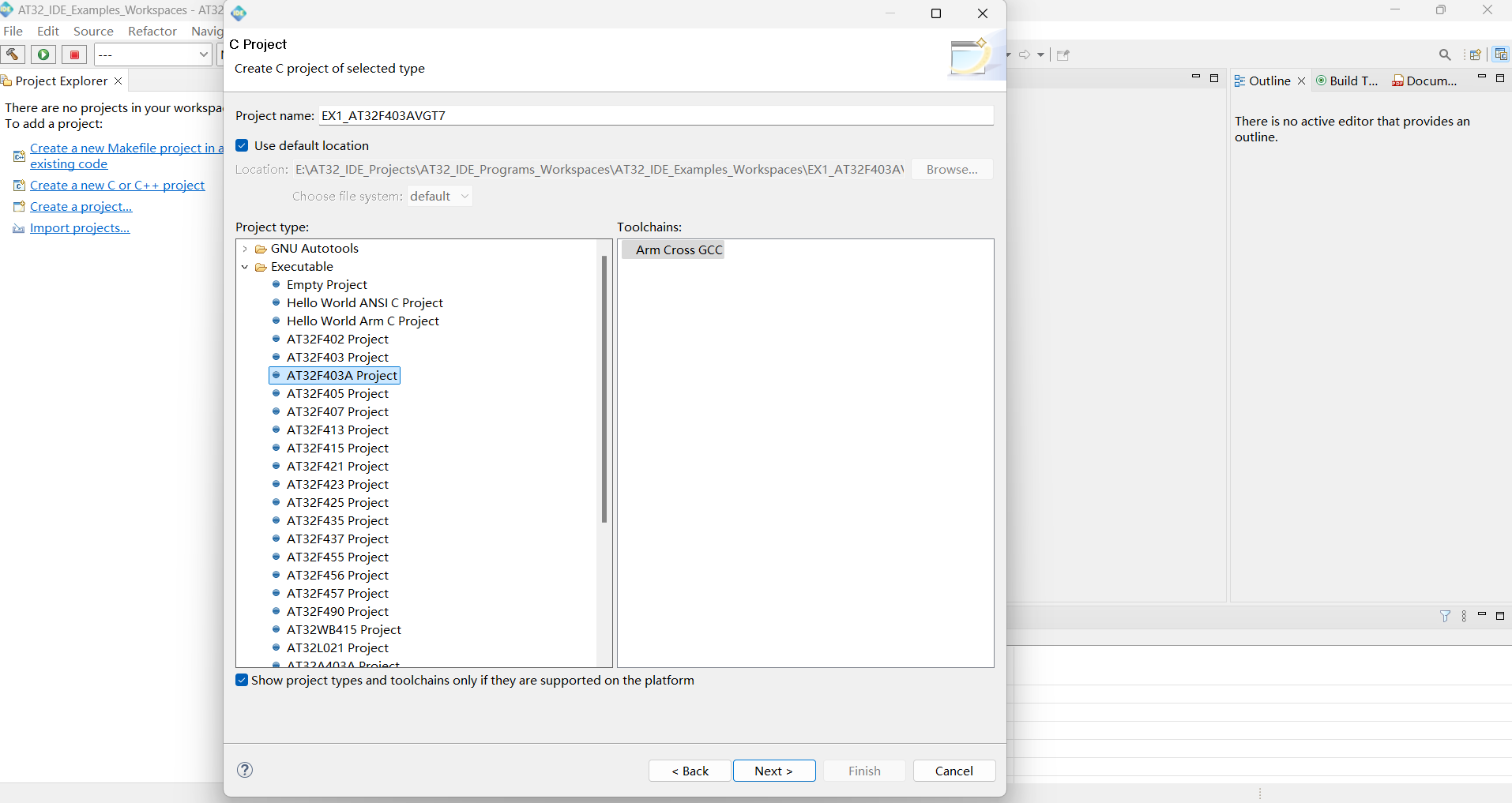 - 项目创建:通过雅特力项目向导,为不同的雅特力目标 MCU 提供创建模板项目。以创建基于 AT32F403AVGT7 的项目为例,在菜单栏选择【File】>【New】>【C Project】,输入项目名称,选择项目类型(如 AT32F403A_407 C Project )和默认工具链(Arm Cross GCC),再按需配置目标芯片、调试等选项,即可完成项目创建 。