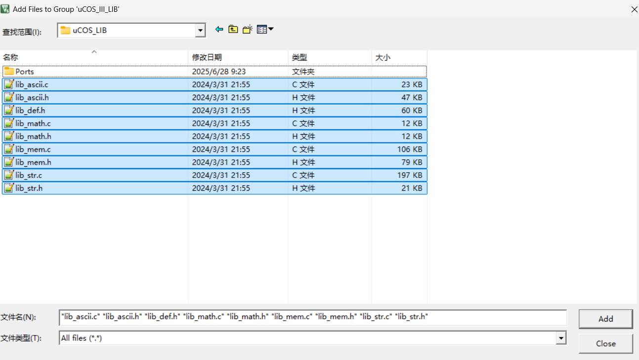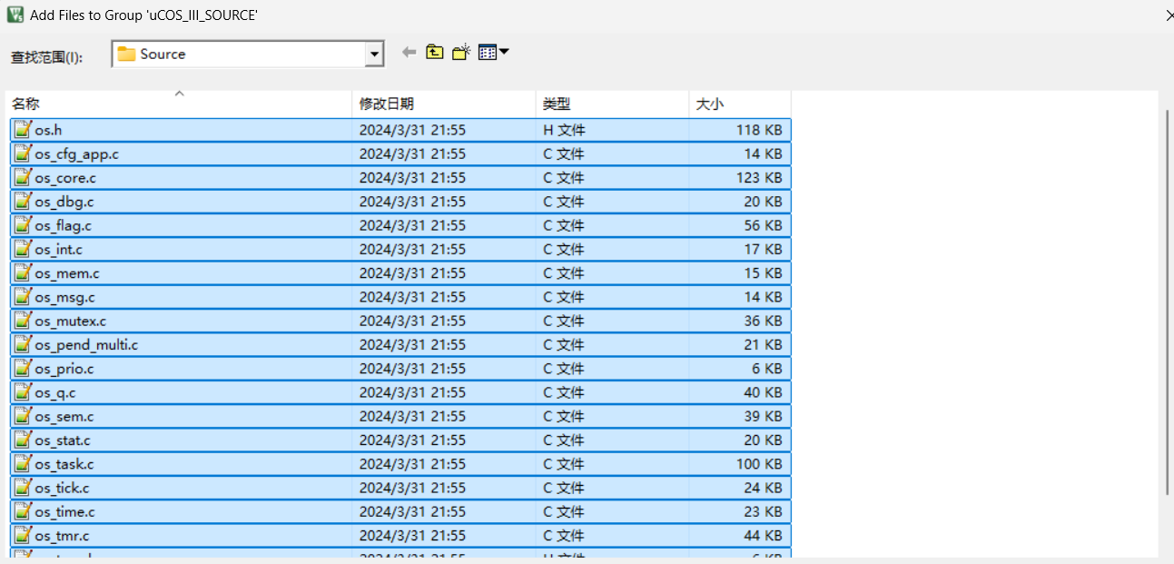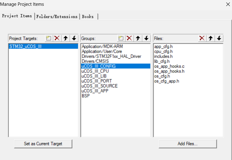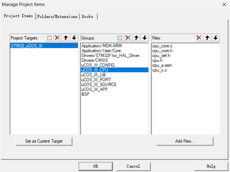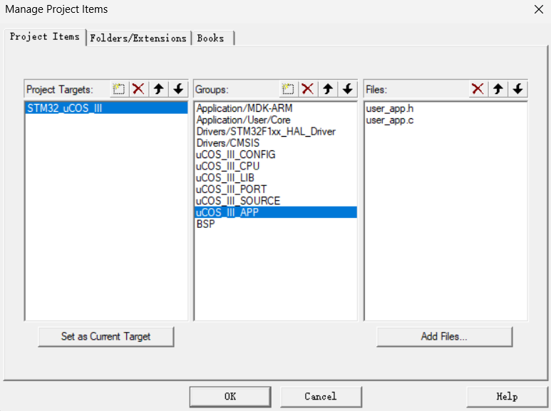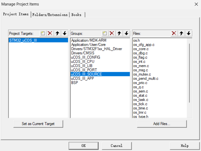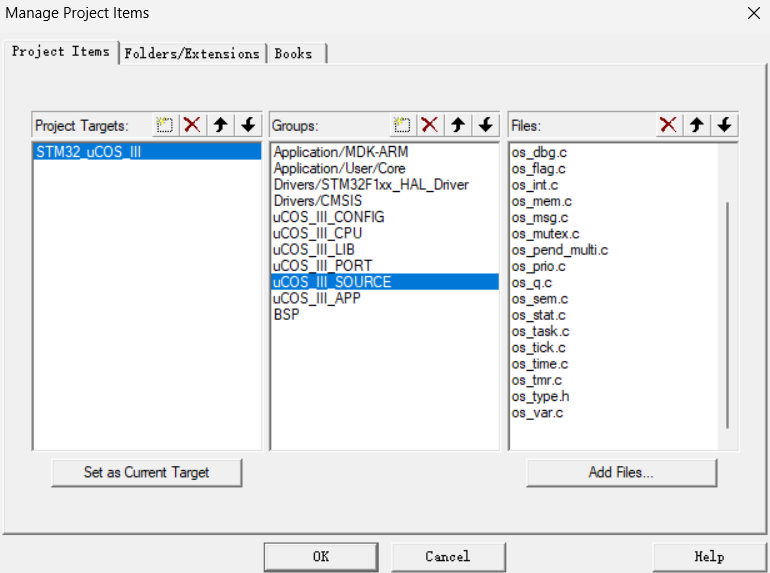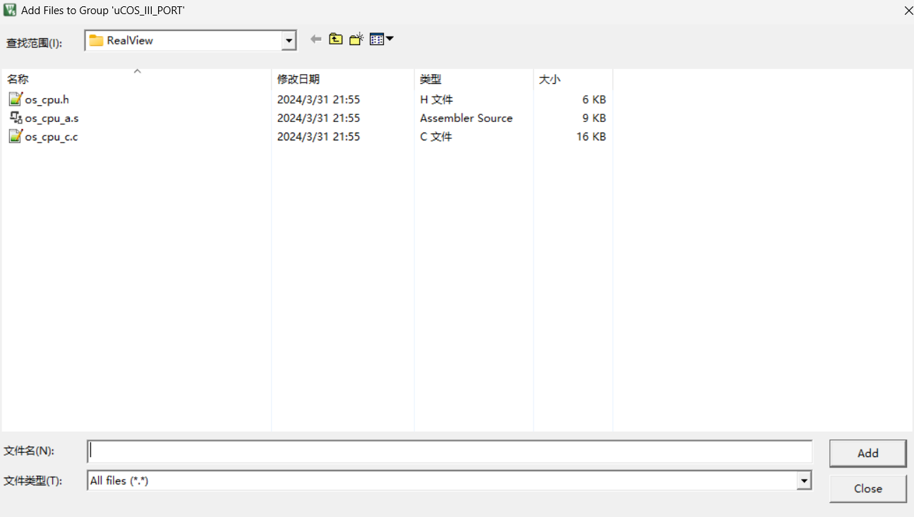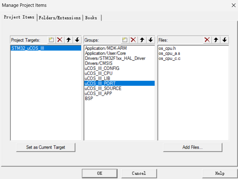 将\STM32_uCOS_III\uCOS_III\uCOS_III\Ports\ARM-Cortex-M3\Generic\RealView下文件加入到uCOS_III_PORT组中。