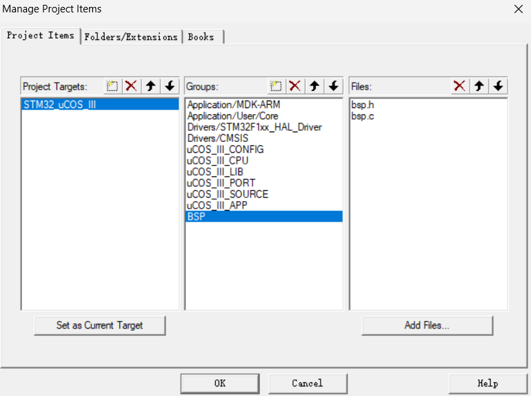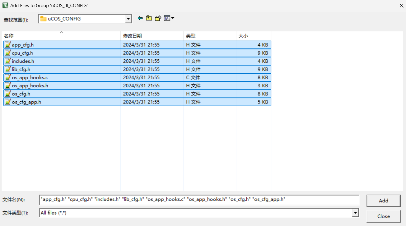 3.在KEIL工程内部将uCOS_III的对应文件夹下的文件对应加入到KEIL工程组当中。