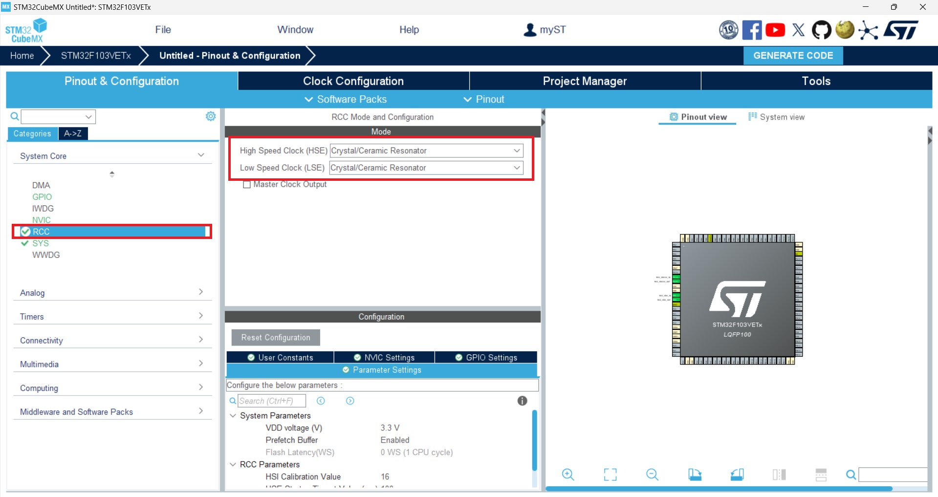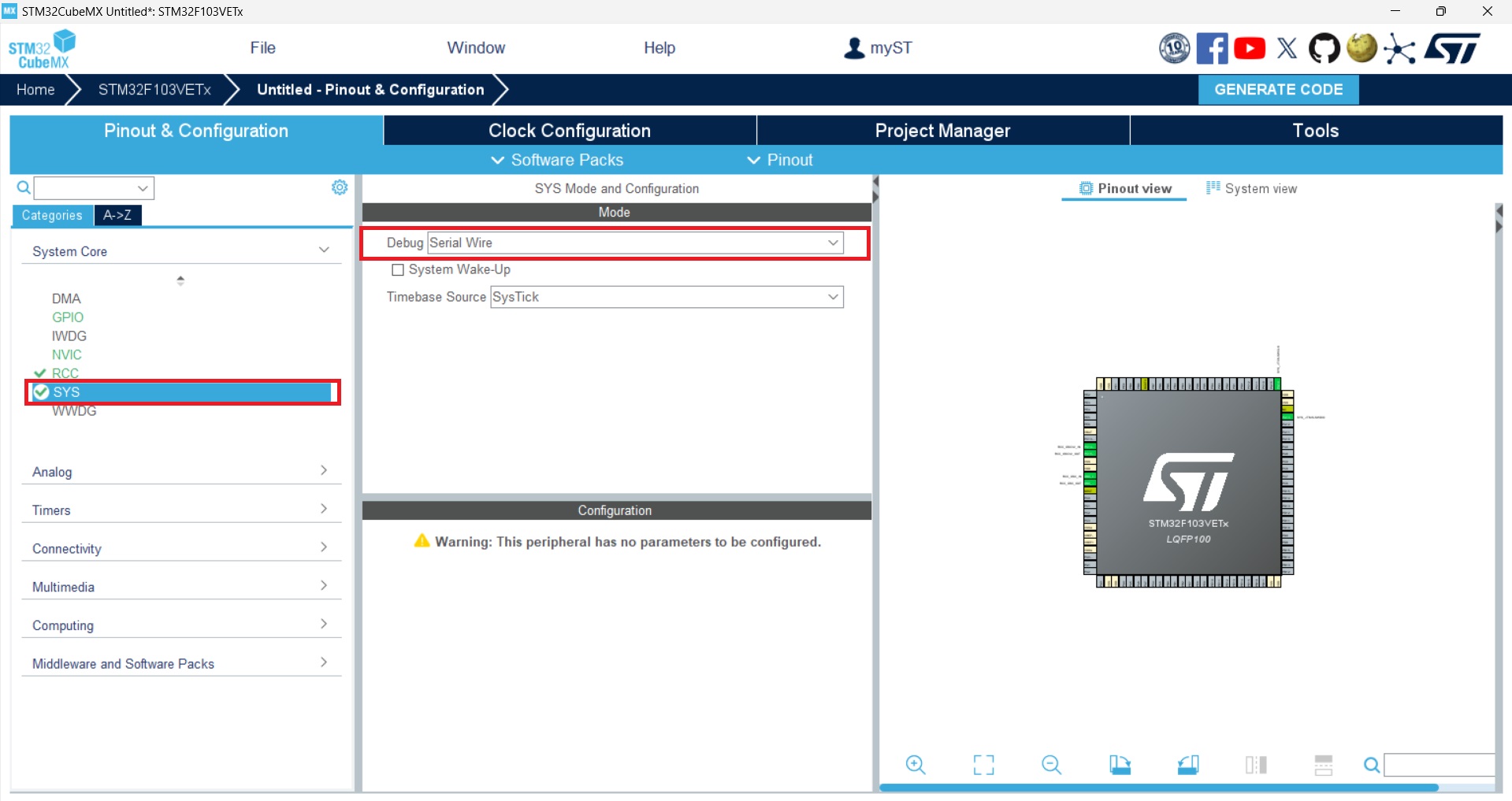1.使用STM32CubeMX创建工程,首先,选择系统时钟来源和开启SWD。