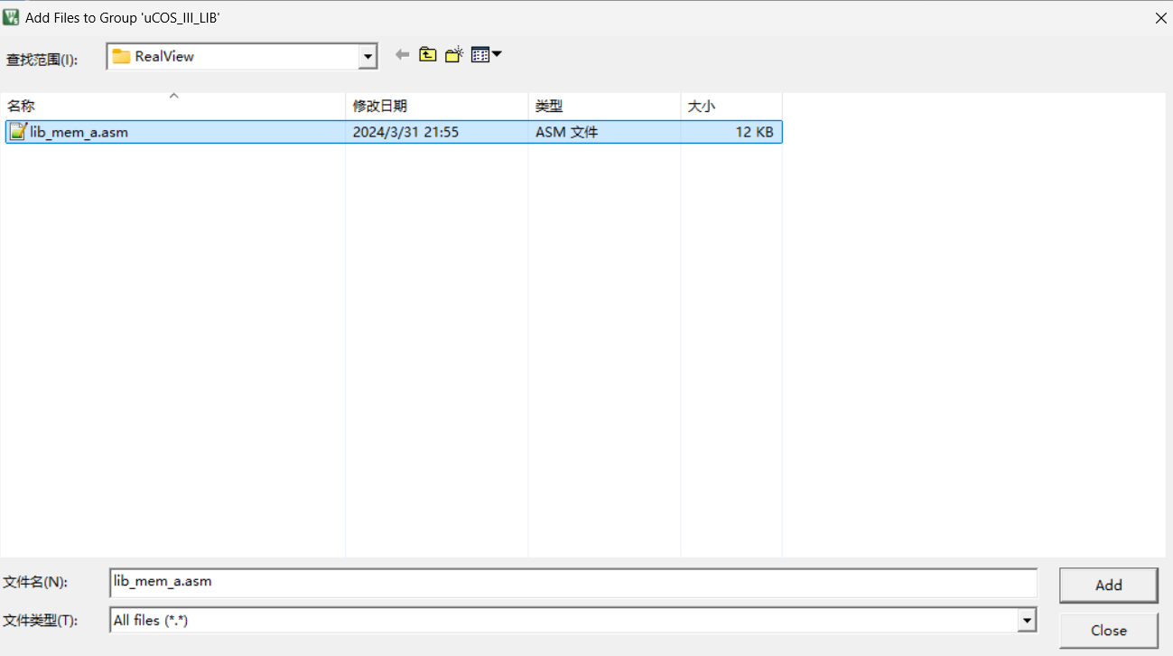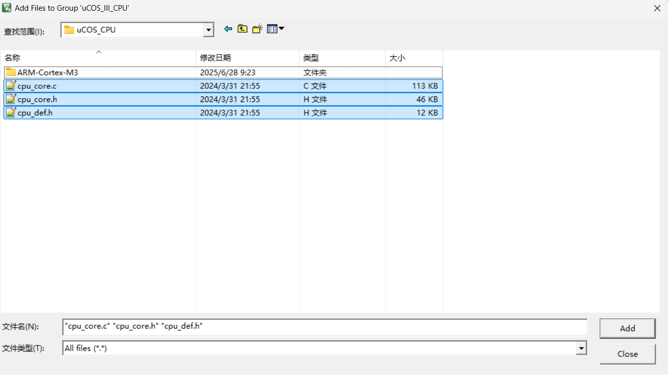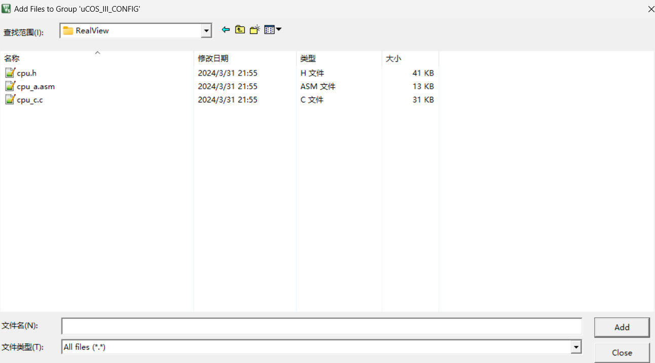 将\STM32_uCOS_III\uCOS_III\uCOS_CPU\ARM-Cortex-M3\RealView下的文件加入到uCOS_III_CPU组中。