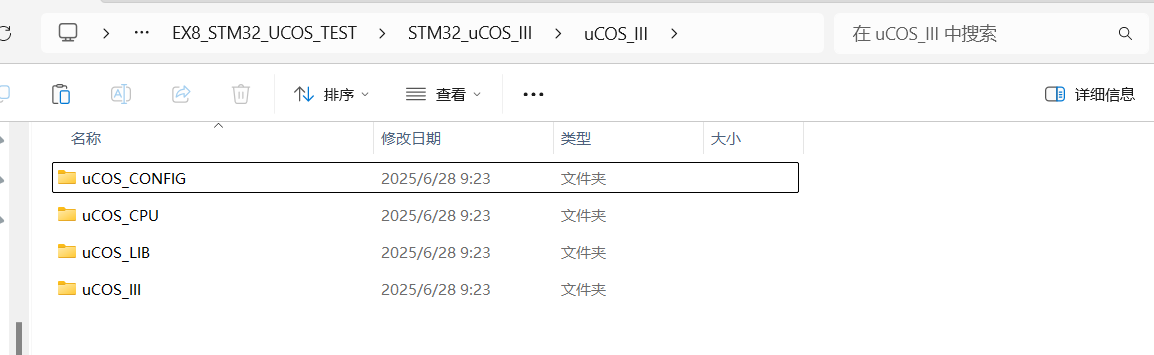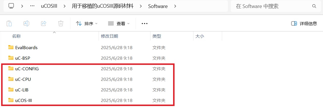 2.将源码的4个文件夹放到新增的uCOS文件夹下,然后我对应将这4个文件重命名了一下,这个根据自己的习惯来。