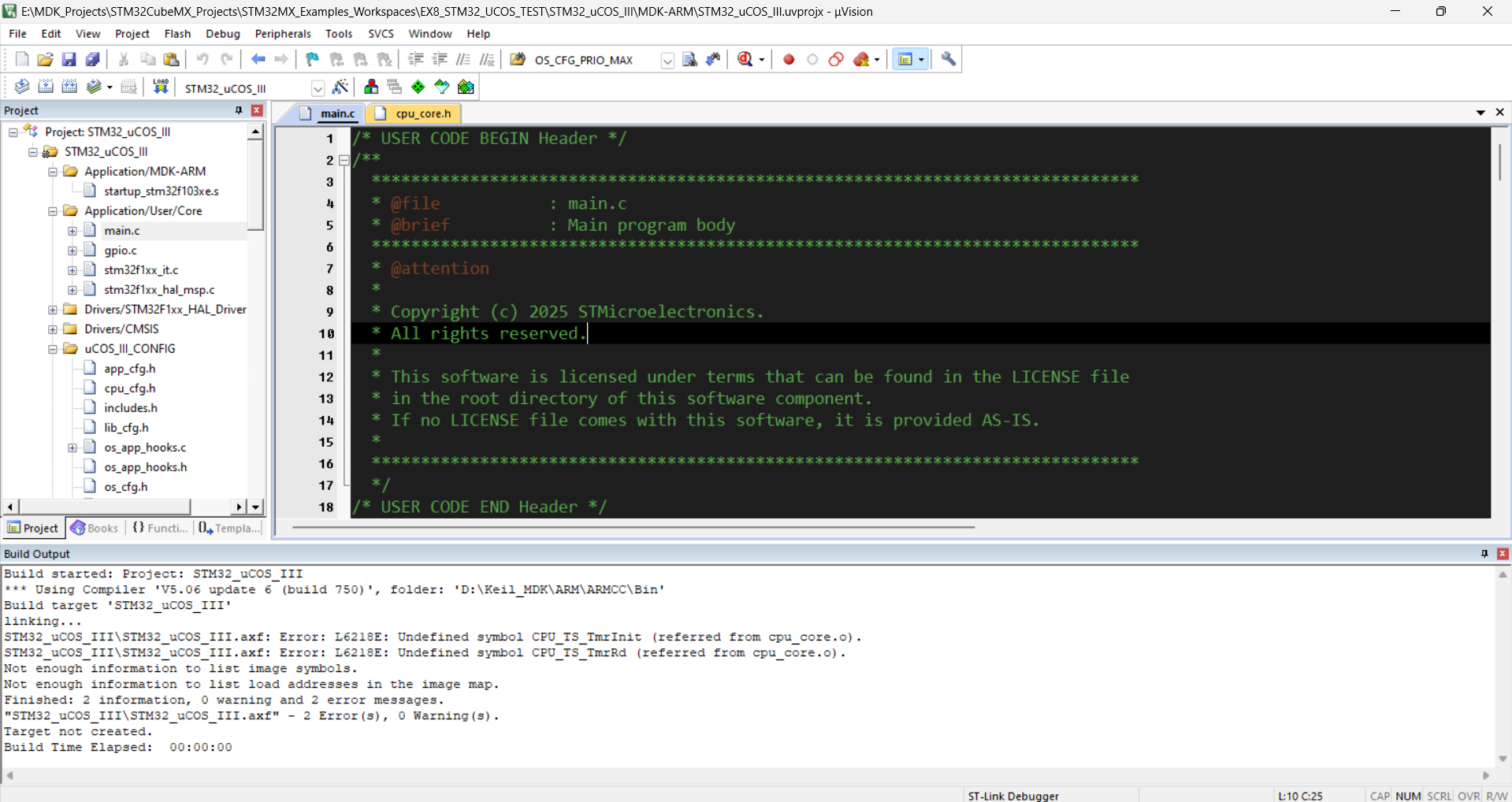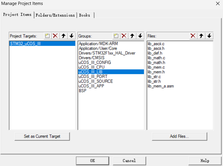 将\STM32_uCOS_III\uCOS_III\uCOS_LIB\Ports\ARM-Cortex-M3\RealView下文件加入uCOS_III_LIB组中。