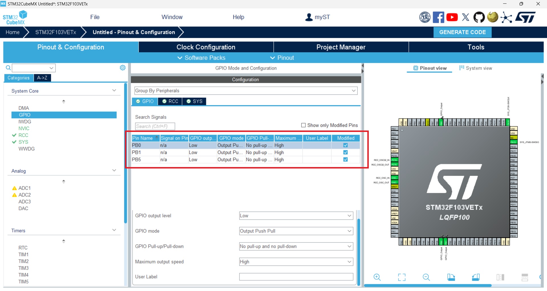2.图形化配置3个GPIO(PB0,PB1,PB5)为GPIO输出,用于进行创建3个Led闪烁的任务以便测试。