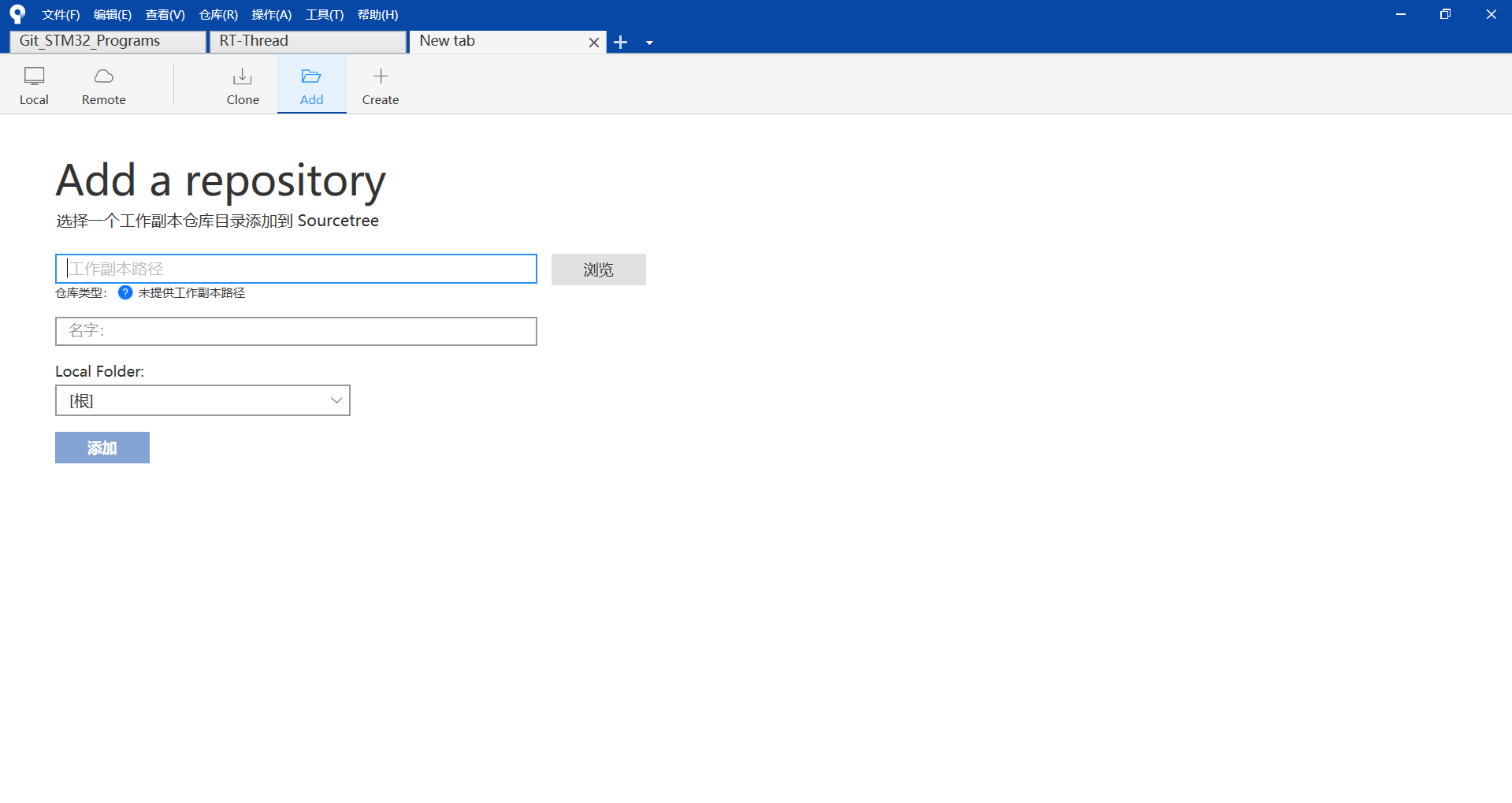 3.然后打开Sourcetree,选择添加仓库选项(在这里就不用介绍关于Sourcetree的下载、安装和配置了,可移至其他优秀文章查看)