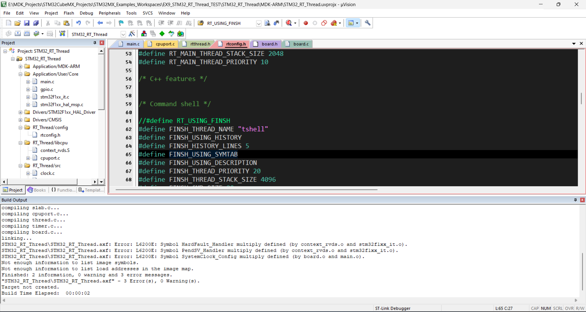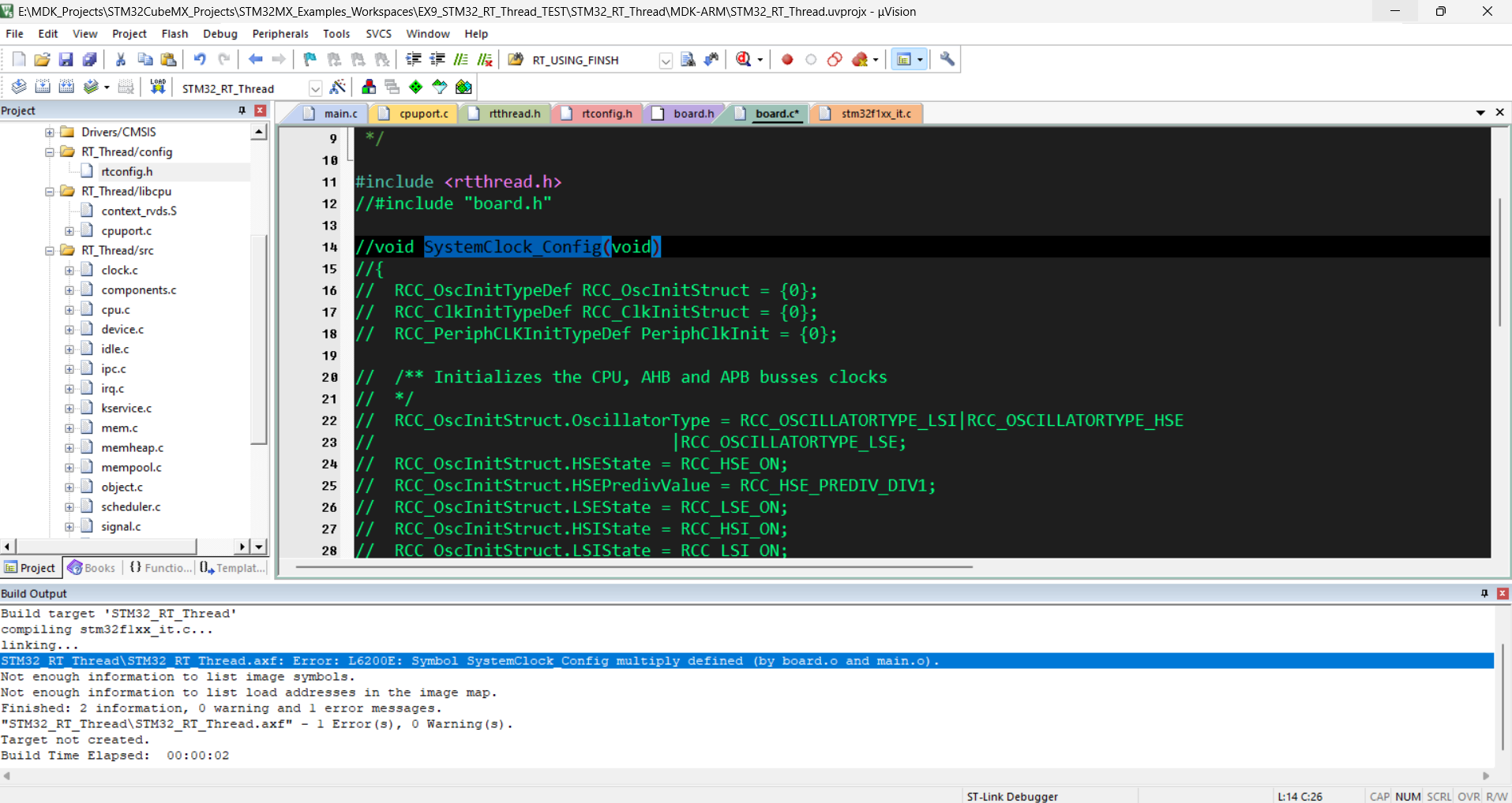 13.本来RT-Thread已经定义了void SystemClock_Config(void),这里注释掉board.c的SystemClock_Config,后面将使用CubeMX生成的SystemClock_Config