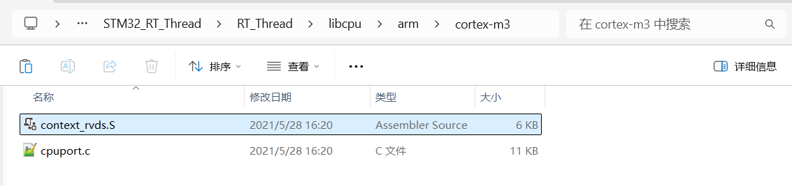 4.根据自己的实际硬件平台具有的内核架构选择,将\STM32_RT_Thread\rt-thread-3.1.5\libcpu\arm\cortex-m3下的context_rvds.S、cpuport.c复制到\STM32_RT_Thread\RT_Thread\libcpu\arm\cortex-m3