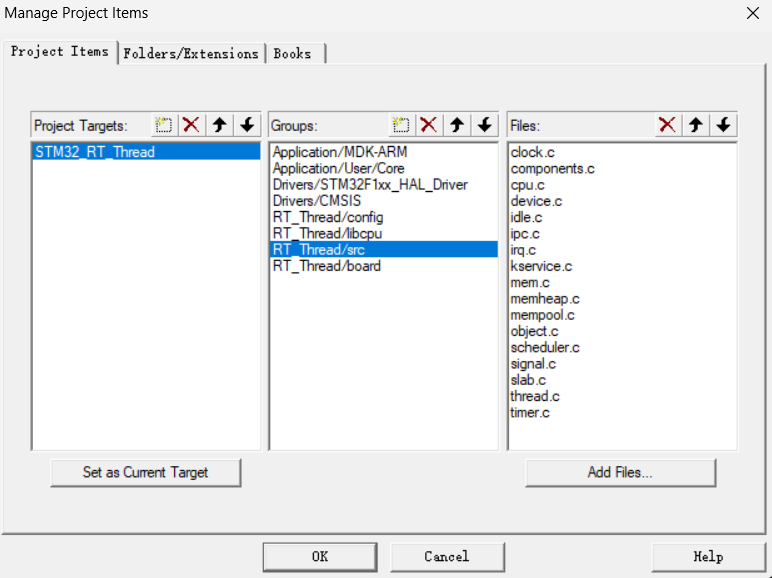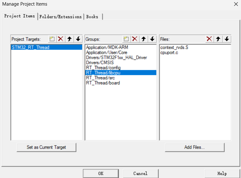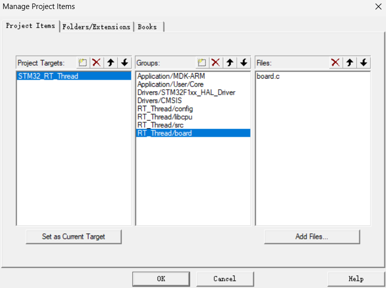 5.在KEIL里新建4个组别RT_Thread/config,RT_Thread/libcpu,RT_Thread/src,RT_Thread/board