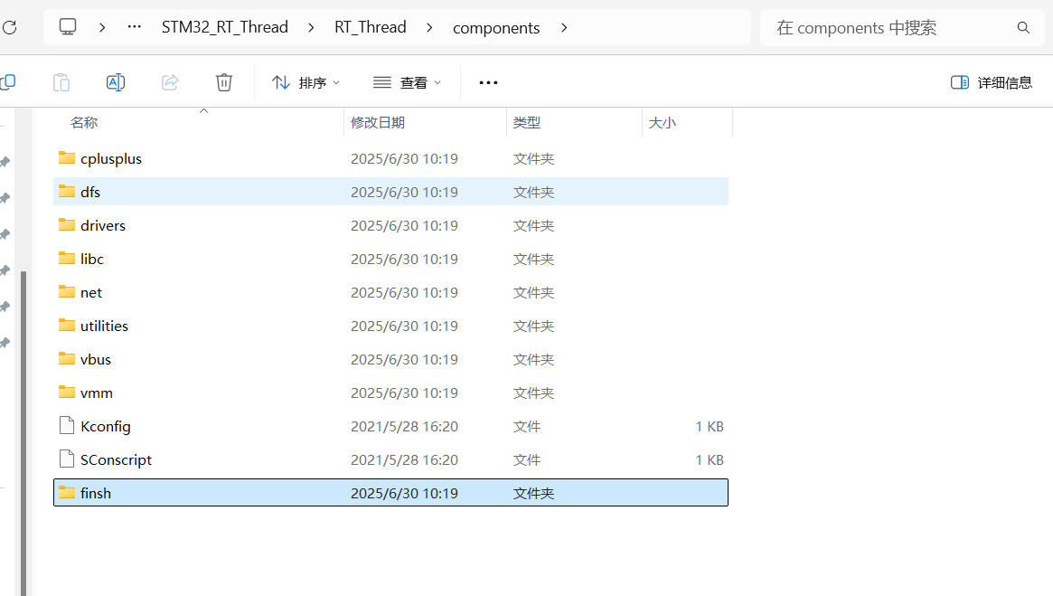 由于\STM32_RT_Thread\RT_Thread\components下的finsh需要注册串口设备,我们这里只移植精简版就把finsh组件删去