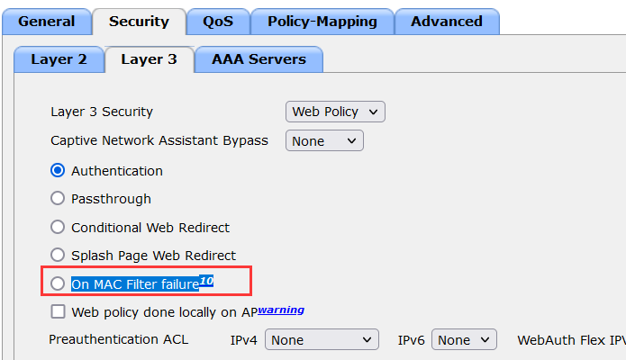 config wlan security web-auth on-macfilter-failure wlan-id