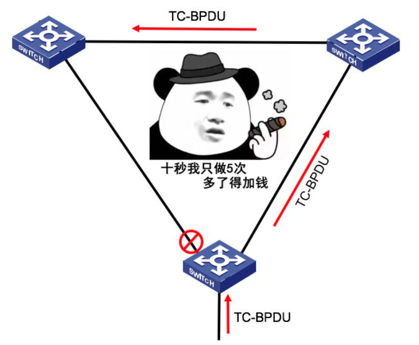 这句说明了,TC BPDU虽然发出来通告拓扑改变,但是如果有“不法分子”攻击设备,让我们的设备收到了大量的TC BPDU,就会让设备在转发条目的刷新(会执行MAC地址表项和ARP表项的删除操作)上耗费大量的资源和时间。于是,我们需要有机制来保护我们的设备,在收到过多的TC BPDU时,免于苦难。