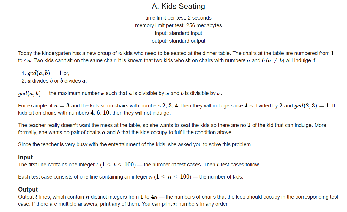 题意:给出一个数n,构造出一个数组,使得不存在任何两个数之间互质或者互成倍数关系,每个数的范围是1~4*n