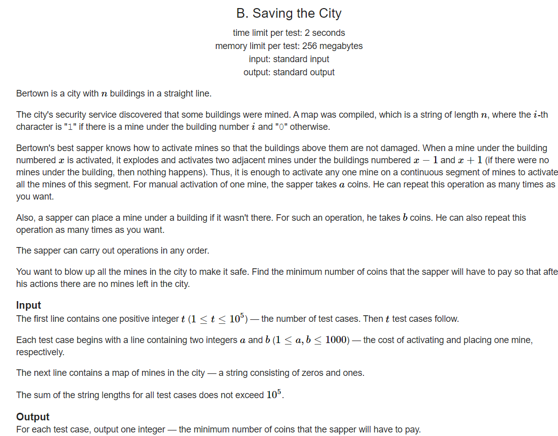题意:给出一个字符串,1表示有地雷,0表示没地雷,要求把所有地雷引爆所需要的的最低费用,a表示引爆一个地雷需要的费用,引爆一个地雷可以把相连的所有地雷一起引爆,b表示埋下一个地雷需要的费用