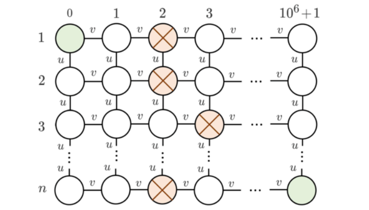 因为在移动的时候不能够穿过障碍,所以现在想通过移动某些障碍使得能从\((1,0)\)走到\((n,10^6+1)\)。障碍只能移到原本没有障碍的位置上,也不能移动到边界外面,可以花费\(u\)枚硬币将障碍上下移动,花费\(v\)枚硬币左右移动。问最少需要花费多少硬币才能从\((1m0)\)走到\((n,10^6+1)\)。