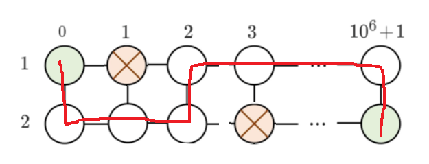 给出一张二维图形,\(n\)行\(10^6+2\)列,如下图所示。每一行都会有一个障碍,第\(i\)行的障碍位于\((i,a_i)\),其中\(1\le a_i\le 1e6\)。