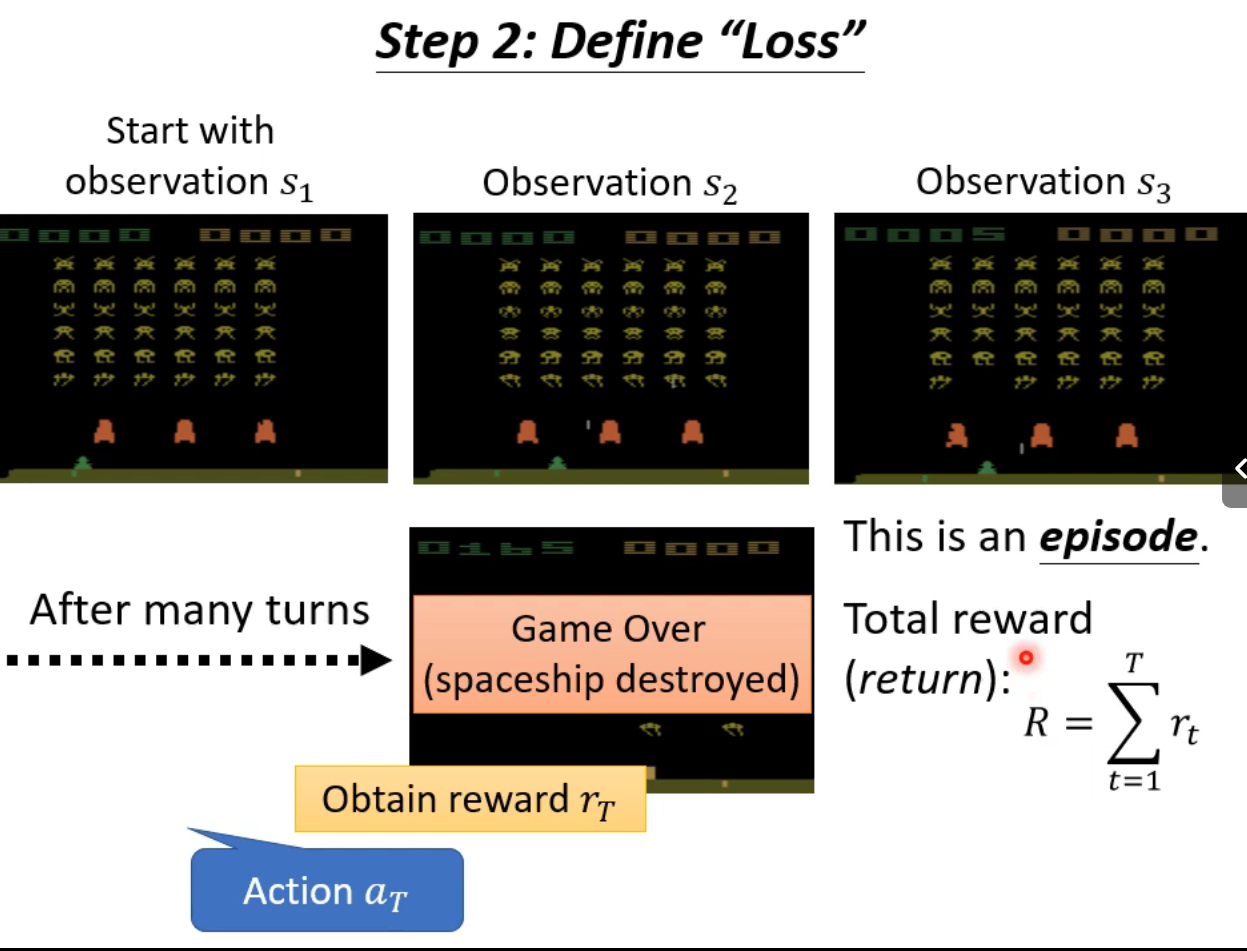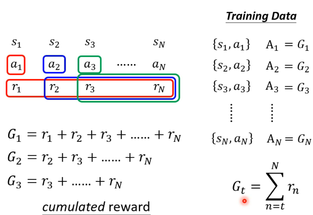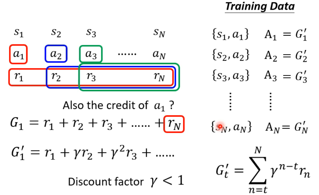 Discount factor 伽马: 从a1得到rn很远,不能保证得到,所以距离越远的奖励衰减越大