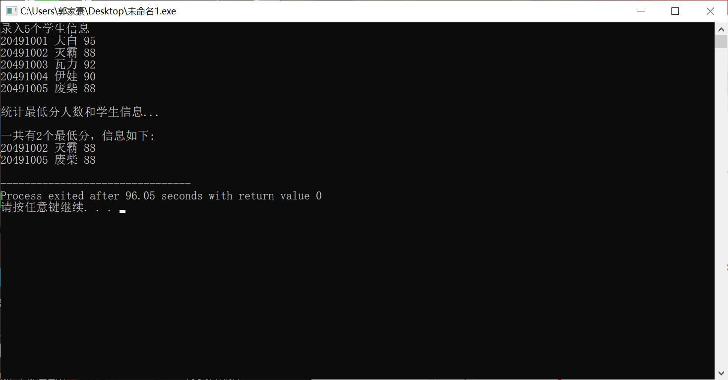 printf("\n一共有%d个最低分,信息如下:\n", count);