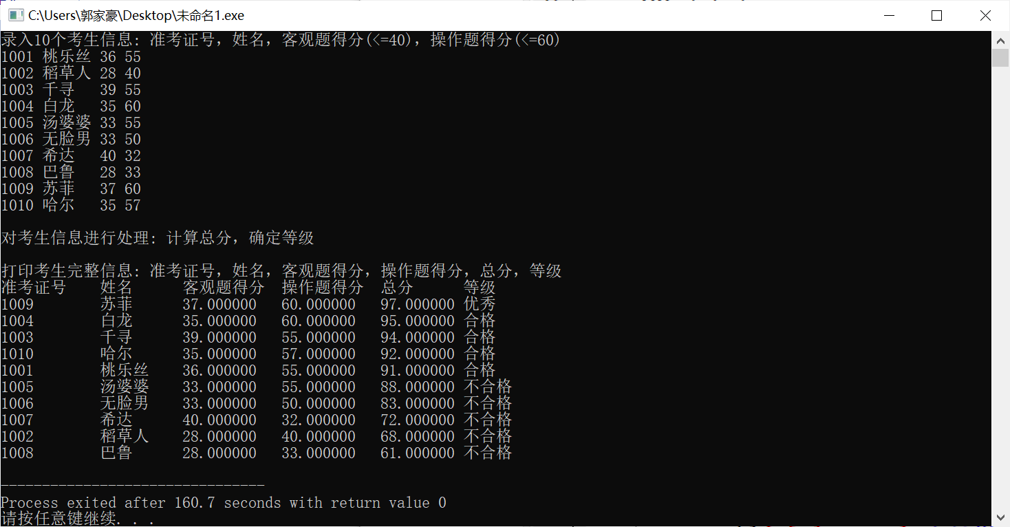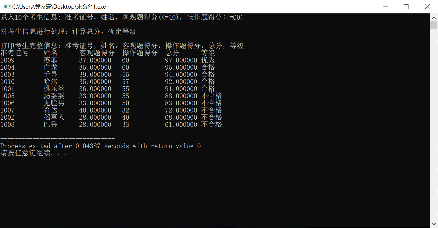 printf("\n打印考生完整信息: 准考证号,姓名,客观题得分,操作题得分,总分,等级\n");