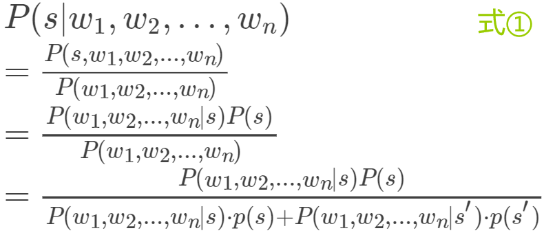 根据朴素贝叶斯的条件独立假设,并设先验概率 P(s)=P(s')=0.5,上式可化为: