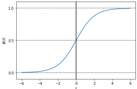 import matplotlib.pyplot as plt import numpy as np def sigmoid(z): return 1.0/(1.0+np.exp(-z)) z=np.arange(-6,6,0.05) plt.plot(z,sigmoid(z)) plt.axvline(0.0,color='k') plt.axhline(y=0.0,ls='dotted',color='k') plt.axhline(y=1.0,ls='dotted',color='k') plt.axhline(y=0.5,ls='dotted',color='k') plt.yticks([0.0,0.5,1.0]) plt.ylim(-0.1,1.1) plt.xlabel('z') plt.ylabel('$\phi (z)$') plt.show()