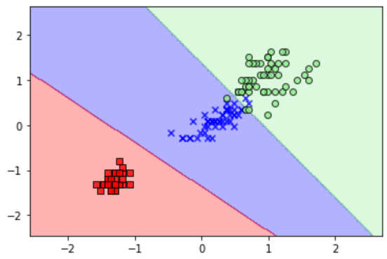 #逻辑斯蒂分类算法 import numpy as np #画图的函数 from matplotlib.colors import ListedColormap import matplotlib.pyplot as plt def plot_decision_regions(X, y, classifier, test_idx=None, resolution=0.02): # setup marker generator and color map markers = ('s', 'x', 'o', '^', 'v') colors = ('red', 'blue', 'lightgreen', 'gray', 'cyan') cmap = ListedColormap(colors[:len(np.unique(y))])#通过ListedColormap来定义一些颜色和标记号,并通过颜色列表生成了颜色示例图 # plot the decision surface #对两个特征的最大值最小值做了限定(使用两个特征来训练感知器) x1_min, x1_max = X[:, 0].min() - 1, X[:, 0].max() + 1 x2_min, x2_max = X[:, 1].min() - 1, X[:, 1].max() + 1 #利用meshgrid函数,将最大值、最小值向量生成二维数组xx1和xx2 xx1, xx2 = np.meshgrid(np.arange(x1_min, x1_max, resolution), np.arange(x2_min, x2_max, resolution)) #创建一个与数据训练集中列数相同的矩阵,以预测多维数组中所有对应点的类标z Z = classifier.predict(np.array([xx1.ravel(), xx2.ravel()]).T) Z = Z.reshape(xx1.shape)#将z变换为与xx1和xx2相同维度 #使用contourf函数,对于网格数组中每个预测的类以不同的颜色绘制出预测得到的决策区域 plt.contourf(xx1, xx2, Z, alpha=0.3, cmap=cmap) plt.xlim(xx1.min(), xx1.max()) plt.ylim(xx2.min(), xx2.max()) for idx, cl in enumerate(np.unique(y)): plt.scatter(x=X[y == cl, 0], y=X[y == cl, 1], alpha=0.8, c=colors[idx], marker=markers[idx], label=cl, edgecolor='black') # highlight test samples if test_idx: # plot all samples X_test, y_test = X[test_idx, :], y[test_idx] plt.scatter(X_test[:, 0], X_test[:, 1], c='', edgecolor='black', alpha=1.0, linewidth=1, marker='o', s=100, label='test set') #训练集与测试集的获取,采用鸢尾花数据集 from sklearn import datasets iris=datasets.load_iris() x=iris.data[:,[2,3]] y=iris.target #对数据集进行划分 from sklearn.model_selection import train_test_split #采用scikit-learn中的cross_validation模块中的train_test_split()函数,随机将iris数据特征矩阵x与类标向量y按照3:7划分为测试数据集和训练数据集 x_train,x_test, y_train, y_test =train_test_split(x,y,test_size=0.3, random_state=0) #为了优化性能,对特征进行标准化处理 from sklearn.preprocessing import StandardScaler sc=StandardScaler() sc.fit(x_train)#通过fit方法,可以计算训练数据中每个特征的样本均值和方差 x_train_std=sc.transform(x_train)#通过调用transform方法,可以使用前面获得的样本均值和方差来对数据做标准化处理 x_test_std=sc.transform(x_test) from sklearn.linear_model import LogisticRegression lr=LogisticRegression(C=1000.0,random_state=0) lr.fit(x_train_std,y_train) print("Training Score:%f"%lr.score(x_train_std,y_train))#返回在(X_train,y_train)上的准确率 print("Testing Score:%f"%lr.score(x_test_std,y_test))#返回在(X_test,y_test)上的准确率 x_combined_std = np.vstack((x_train_std, x_test_std))#将数组垂直排列成多个子数组的列表。 y_combined = np.hstack((y_train, y_test))# 按水平顺序(列)顺序堆栈数组。 plot_decision_regions(X=x_combined_std, y=y_combined, classifier=lr, test_idx=range(105, 150)) plt.xlabel('petal length [standardized]') plt.ylabel('petal width [standardized]') plt.legend(loc='upper left') plt.show()