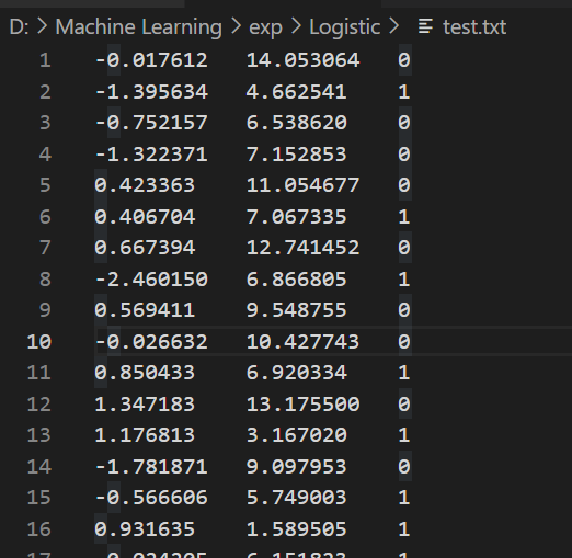 # 加载数据集 def loadDataSet(): dataMat = [] # 数据列表 labelMat = [] # 标签列表 fr = open('test.txt') # 打开文件 for line in fr.readlines(): # 遍历每行,读取数据 lineArr = line.strip().split() # 去除回车符 dataMat.append([1.0, float(lineArr[0]), float(lineArr[1])]) # 把此行的数据添加到数据列表里面 labelMat.append(int(lineArr[2])) # 添加标签进列表 return dataMat, labelMat # sigmoid函数 def sigmoid(inX): return 1.0 / (1 + exp(-inX)) # 梯度上升算法 def gradAscent(dataMatIn, classLabels): dataMatrix = mat(dataMatIn) labelMat = mat(classLabels).transpose() m, n = shape(dataMatrix) # 获取数据集矩阵的大小,m为行数,n为列数 alpha = 0.001 # 步长 maxCycles = 500 # 迭代次数 weights = ones((n, 1)) # 权重初始化为1 for k in range(maxCycles): # 重复矩阵运算 h = sigmoid(dataMatrix * weights) error = (labelMat - h) # 计算误差 weights = weights + alpha * dataMatrix.transpose() * error return weights # 获得回归系数 dataMat, labelMat = loadDataSet() weigths = gradAscent(dataMat, labelMat) print("w0: %f, w1: %f, W2: %f" % (weigths[0], weigths[1], weigths[2]))