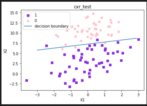 # 绘制数据集和Logistic回归最佳拟合直线 def plotBestFit(weights): dataMat, labelMat = loadDataSet() dataArr = array(dataMat) n = shape(dataArr)[0] # 获取数据总数 xcord1 = []; ycord1 = [] # 存放正样本 xcord2 = []; ycord2 = [] # 存放负样本 for i in range(n): # 依据数据集的标签来对数据进行分类 if int(labelMat[i]) == 1: # 数据的标签为1,表示为正样本 xcord1.append(dataArr[i, 1]); ycord1.append(dataArr[i, 2]) else: xcord2.append(dataArr[i, 1]); ycord2.append(dataArr[i, 2]) fig = plt.figure() ax = fig.add_subplot(111) ax.scatter(xcord1, ycord1, s=30, c='blueviolet', marker='s') # 绘制正样本 ax.scatter(xcord2, ycord2, s=30, c='pink') # 绘制负样本 x = arange(-3.0, 3.0, 0.1) y = (-weights[0] - weights[1] * x) / weights[2] ax.plot(x, y) plt.title('cxr_test') plt.xlabel('X1'); plt.ylabel('X2')