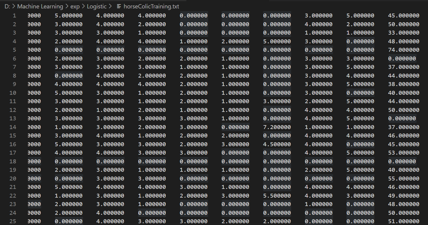 def classifyVector(inX, weights): prob = sigmoid(sum(inX * weights)) #大于0.5 返回 1;否则返回0 if prob > 0.5: return 1.0 else: return 0.0 def colicTest(): frTrain = open('HorseColicTraining.txt') frTest = open('HorseColicTest.txt') trainingSet = [] trainingLabels = [] for line in frTrain.readlines(): currLine = line.strip().split('\t') #分割 lineArr = [] for i in range(21): lineArr.append(float(currLine[i])) #存入训练样本特征 trainingSet.append(lineArr) #存入训练样本标签 trainingLabels.append(float(currLine[21])) #使用改进后的随机梯度下降算法得到回归系数 trainingWeights = stoGradAscent1(array(trainingSet), trainingLabels, 500) #统计测试集预测错误样本数量和样本总数 errorCount = 0 numTestVec = 0.0 for line in frTest.readlines(): #循环一次,样本数加1 numTestVec += 1.0 currLine = line.strip().split('\t') #分割 lineArr = [] for i in range(21): lineArr.append(float(currLine[i])) # 利用分类预测函数对该样本进行预测,并与样本标签进行比较 if int(classifyVector(array(lineArr), trainingWeights)) != int(currLine[21]): errorCount += 1 #计算错误率 errorRate = (float(errorCount) / numTestVec) print('the error rate of this test is : %f' % errorRate) return errorRate #调用colicTest10次,求平均值 def multiTest(): numTests = 10 errorSum = 0.0 for k in range(numTests): errorSum += colicTest() print('after %d iterations the average error rete is : %f ' % (numTests,errorSum / float(numTests)))