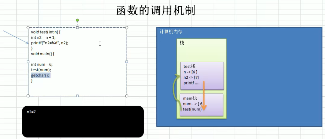 1 #include <stdio.h> 2 3 4 //说明 5 //1.函数名字test 6 //2.函数没有返回,void 7 //3.完成功能:传入一个数+1 8 void test(int n){ 9 int n2 = n + 1; 10 printf("n2=%d", n2); 11 } 12 void main(){ 13 int num = 6; 14 test(num); 15 }