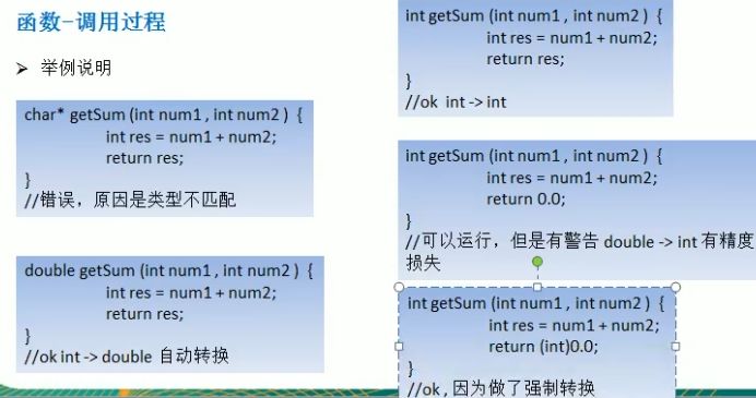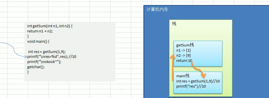 1 #include <stdio.h> 2 3 //说明 4 //1.函数名字getSum 5 //2.函数有返回,int 6 //3.完成功能:传入两个数后相加 7 int getSum(int n1, int n2){ 8 return n1 + n2; 9 } 10 void main(){ 11 int res = getSum(1, 9); 12 printf("res=%d", res); 13 }
