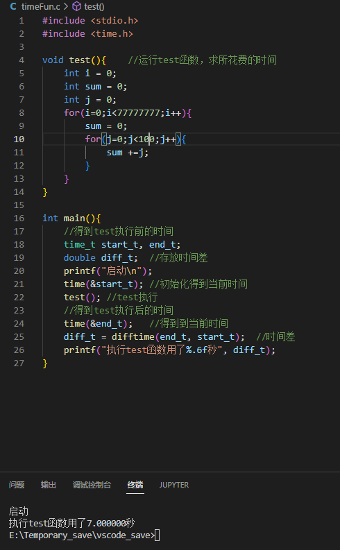 1 #include <stdio.h> 2 #include <time.h> 3 4 void test(){ //运行test函数,求所花费的时间 5 int i = 0; 6 int sum = 0; 7 int j = 0; 8 for(i=0;i<7777777;i++){ 9 sum = 0; 10 for(j=0;j<100;j++){ 11 sum +=j; 12 } 13 } 14 } 15 16 int main(){ 17 //得到test执行前的时间 18 time_t start_t, end_t; 19 double diff_t; //存放时间差 20 printf("启动\n"); 21 time(&start_t); //初始化得到当前时间 22 test(); //test执行 23 //得到test执行后的时间 24 time(&end_t); //得到到当前时间 25 diff_t = difftime(end_t, start_t); //时间差 26 printf("执行test函数用了%.6f秒", diff_t); 27 }