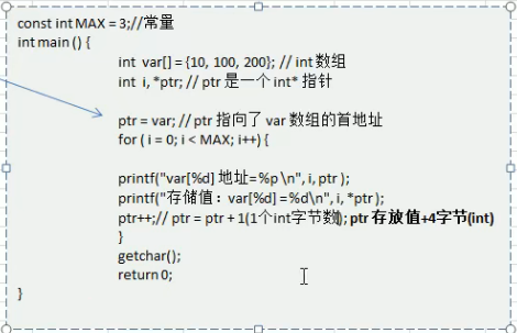 地址+1,但是定义是int的指针,int有四字节,所以指针保存的地址在内存中+4,即指向数组中下一个元素