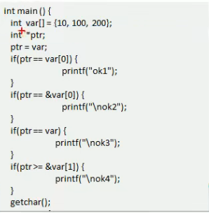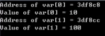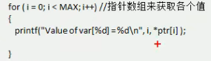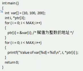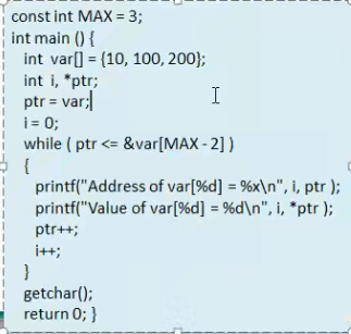 1 #include <stdio.h> 2 3 const int MAX = 3; 4 5 int main(){ 6 int var[] = {10,100,200}; 7 int *ptr[3]; 8 for(int i = 0; i < MAX; i++){ 9 ptr[i] = &var[i]; 10 } 11 for(int i = 0; i < MAX; i++){ 12 printf("Value of var[%d] = %d\n", i, *ptr[i]); 13 } 14 return 0; 15 }