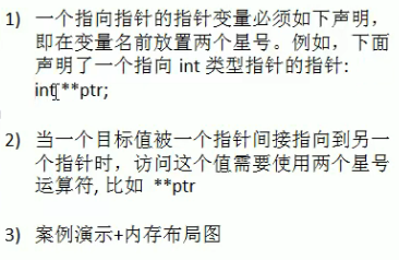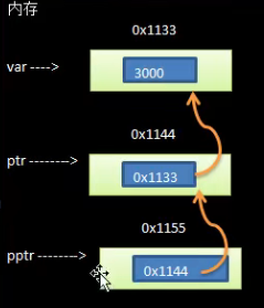 1 #include <stdio.h> 2 3 int main(){ 4 int var; 5 int *ptr; 6 int **pptr; 7 var = 3000; 8 ptr = &var; //把var变量的地址赋值给ptr 9 pptr = &ptr; //把ptr存放的地址赋值给pptr 10 printf("var的地址=%p var=%d\n", &var, var); 11 printf("ptr本身的地址=%p ptr存放的地址=%p ptr=%d\n", &ptr, ptr, *ptr); 12 printf("pptr本身的地址=%p pptr存放的地址=%p pptr=%d\n", &pptr, pptr, **pptr); 13 return 0; 14 }