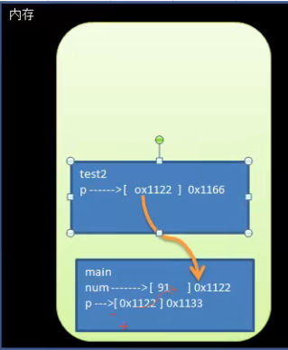 1 #include <stdio.h> 2 3 //函数写在main前就不用声明,写在main后就需要在前面声明 4 void test2(int *p); //函数声明,接收int * 5 6 void main(){ 7 int num = 90; 8 int *p = # //把num地址赋值给p 9 test2(&num); //传地址 10 printf("\n main()中的num=%d", num); 11 test2(p); //传指针 12 printf("\n main()中的num=%d", num); 13 } 14 15 void test2(int *p){ 16 *p += 1; 17 }
