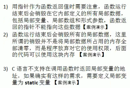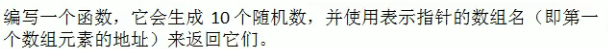 1 #include <stdio.h> 2 #include <stdlib.h> 3 4 int *random1(){ 5 static int arr[10]; //让arr的空间在静态数据区保存 6 for(int i = 0; i < 10; i++){ 7 arr[i] = rand(); 8 } 9 return arr; 10 } 11 12 void main(){ 13 int *p; 14 p = random1(); //p指向在random1生成的数组的首地址(即第一个元素的地址) 15 for(int i = 0; i < 10; i++){ 16 printf("\n%d",*(p+i)); 17 } 18 }