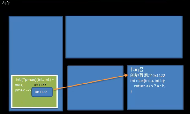 1 #include <stdio.h> 2 3 int max(int a, int b); 4 5 int main(){ 6 int x, y, maxVal; 7 //函数指针 8 //函数指针名字是pmax 9 //int表示该函数指针指向的函数是返回int类型 10 //(int , int)表示该函数指针指向的函数形参是接收两个int 11 //要注意这个函数指针是有地址的 12 //在定义函数指针时,也可以写形参名(可以不与指向的函数形参名或者传递的变量名相同),如:int (*pmax)(int i, int j) = max; 13 //简单理解为:本身有地址的pmax函数指针保存了max函数的地址// 14 int (*pmax)(int, int) = max; 15 printf("Input two numbers:"); 16 scanf("%d%d", &x, &y); 17 maxVal = (*pmax)(x,y); //通过函数指针去调用参数,即*pmax-->max,当然也可以写成pmax(x,y)也是允许的 18 //类似于*pmax取到了函数max的首地址 19 //maxVal = max(x,y); 20 printf("Max value = %d\n", maxVal); 21 printf("pmax保存的地址:%p,pmax本身的地址:%p", pmax, &pmax); 22 return 0; 23 } 24 25 int max(int a,int b){ //Max函数,接收两个int,返回值大的 26 return a>b ? a:b; 27 }