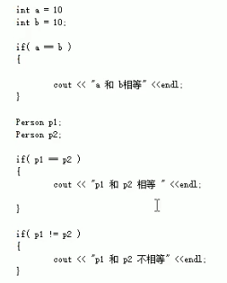 1 #include <iostream> 2 3 using namespace std; 4 5 class Person{ 6 public: 7 Person(string name, int age){ 8 mName = name; 9 mAge = age; 10 } 11 12 bool operator==(Person &p){ 13 if(this-> mName == p.mName && this -> mAge == p.mAge){ 14 return true; 15 } 16 else{ 17 return false; 18 } 19 } 20 21 // bool operator!=(Person &p){ 22 // if(this-> mName == p.mName && this -> mAge == p.mAge){ 23 // return false; 24 // } 25 // else{ 26 // return true; 27 // } 28 // } 29 30 string mName; 31 int mAge; 32 }; 33 34 void test01(){ 35 Person p1("Tom", 18); 36 Person p2("Tom", 19); 37 if(p1 == p2){ 38 cout << "p1和p2是相等的!" << endl; 39 } 40 else{ 41 cout << "p1和p2是不相等的!" << endl; 42 } 43 // if(p1 != p2){ 44 // cout << "p1和p2是不相等的!" << endl; 45 // } 46 // else{ 47 // cout << "p1和p2是相等的!" << endl; 48 // } 49 } 50 51 int main(){ 52 test01(); 53 system("pause"); 54 return 0; 55 }