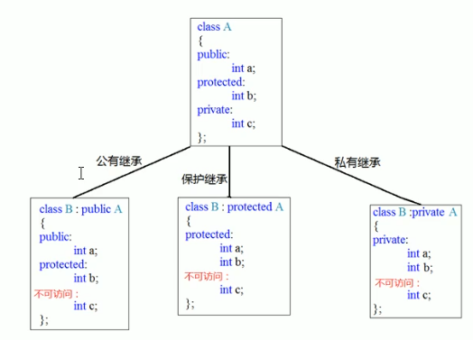 ①.公共继承:成员在父类是怎样的,在子类就是怎样的(如图中a是父类的公共成员,b是父类的包含成员,那么在子类中,a是子类的公共成员,b是子类的保护成员)。。