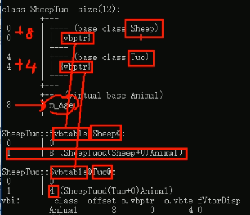 相当于现在采用了虚基类表,保存了类中成员的偏移量,让指针指向这个偏移量,在调用的时候,避免了二义性的发生。。