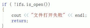 采用is_open()函数,这个函数是一个布尔值函数,只返回true或者false,加上取反符号,可以让文件打开失败时执行判断语句体内的代码