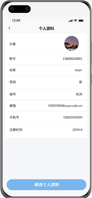我的界面有用户头像、个人资料通道、下单记录通道、关于APP通道、设置通道。点击个人资料后,将显示用户的个人资料,用户也可以修改个人资料。点击我的报名后将跳到订单界面。点击关于APP可以查看APP的版本号信息。点击设置将跳转到设置界面,在设置界面,用户可以在“账号与安全”里进行密码的修改。