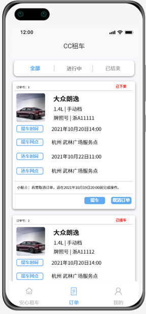 订单的顶部导航栏分为全部、进行中和已结束。进行中包括“已下单”、“已提车”、“已还车”状态的订单。