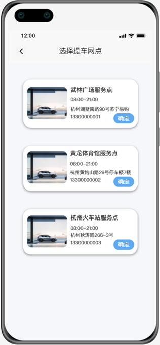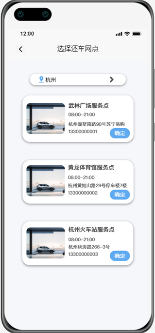 (5)用户在首页选择城市时,只能选择系统提供的拥有网点的城市,选择提车网点时只能在当前城市中选择网点,选择还车网点时可以重新选择还车城市。