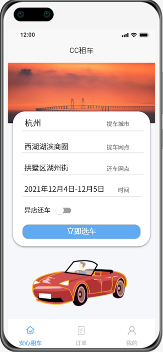在首页,从顶到底依次为标题栏、背景图片、提车城市、提车网点、还车网点、时间、异地还车开关、立即选车按钮、图标、底部导航栏。底部导航栏分为安心租车、订单和我的三部分。用户应当先后选择提车城市、提车网点、还车网点、提车时间还车时间、是否异店还车等,这些均在点击事件发生后跳转到相应的界面进行选择。在选择还车网点页面,用户可以更改城市,然后选择网点还车。用户查看并选择车型后,来到订单详细界面,用户可以取消订单生成,也可以确定订单生成。